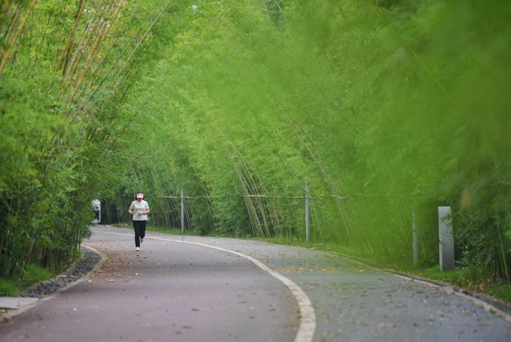 在四川省宜賓市江安縣長江竹島,市民在由河中村改造成的綠色生態(tài)公園里跑步(2023年5月31日攝)。新華社記者 劉坤 攝 水與人、水與城、人與自然和諧共生,生產(chǎn)空間、生活空間、生態(tài)空間互利共榮的畫卷正徐徐展開。