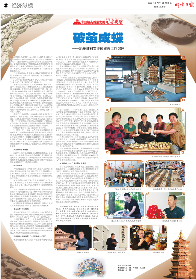 今年以來,定襄縣把雕刻專業(yè)鎮(zhèn)建設(shè)作為加快產(chǎn)業(yè)轉(zhuǎn)型升級、推進(jìn)市場主體倍增、發(fā)揮縣域特色優(yōu)勢、鍛造發(fā)展長板的重要抓手,充分發(fā)揮本縣雕刻產(chǎn)業(yè)的基礎(chǔ)優(yōu)勢和資源稟賦,培龍頭、塑品牌、拓市場、建基地、育人才、擴(kuò)宣傳、送政策,以特色專業(yè)鎮(zhèn)建設(shè)為高質(zhì)量發(fā)展注入新動能。
