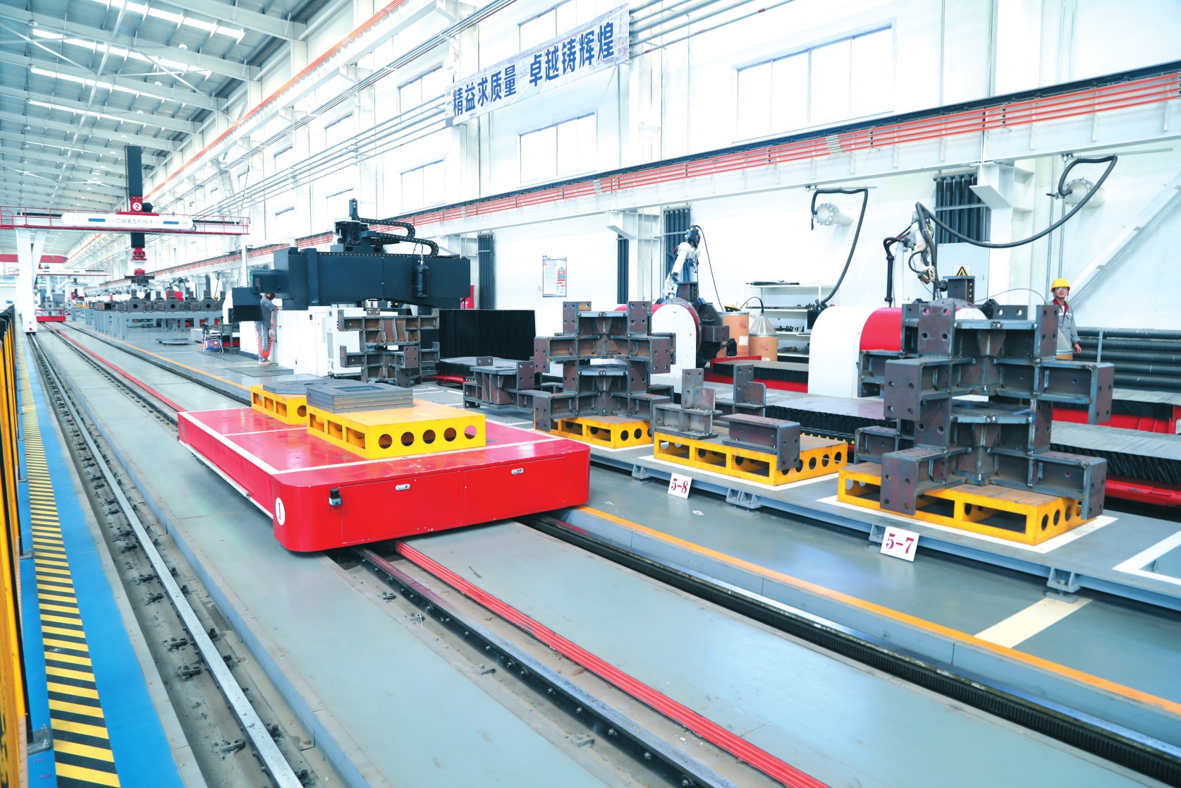 比如全流程智能化作業(yè)的鋼結(jié)構(gòu)構(gòu)件成品焊接生產(chǎn)線,通過(guò)三軸機(jī)械手、雙軸旋轉(zhuǎn)變位機(jī)、焊接機(jī)器人等智能設(shè)備實(shí)現(xiàn)精準(zhǔn)組裝、焊接。經(jīng)激光檢測(cè)確保構(gòu)件精度后,由打磨機(jī)械手完成自動(dòng)化焊縫處理,再通過(guò)端面精銑和拋丸工藝提升成品質(zhì)量,最后在全封閉的智能噴涂工作站完成涂裝烘干。構(gòu)件精度,居然精確到“絲”。