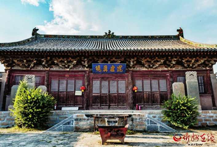 該寺建于高7米的土臺之上,四周筑高堡圍墻,“踞高而臨深”。寺內現(xiàn)存建筑除大殿外,還有東配殿5間,西配房5間,庫房3間。正殿懸匾“毗廬真境”。面闊5間,七檁六椽,懸山頂花琉璃獸脊。斗拱六鋪作單抄雙下昂,補間斗拱斜拱一朵。
