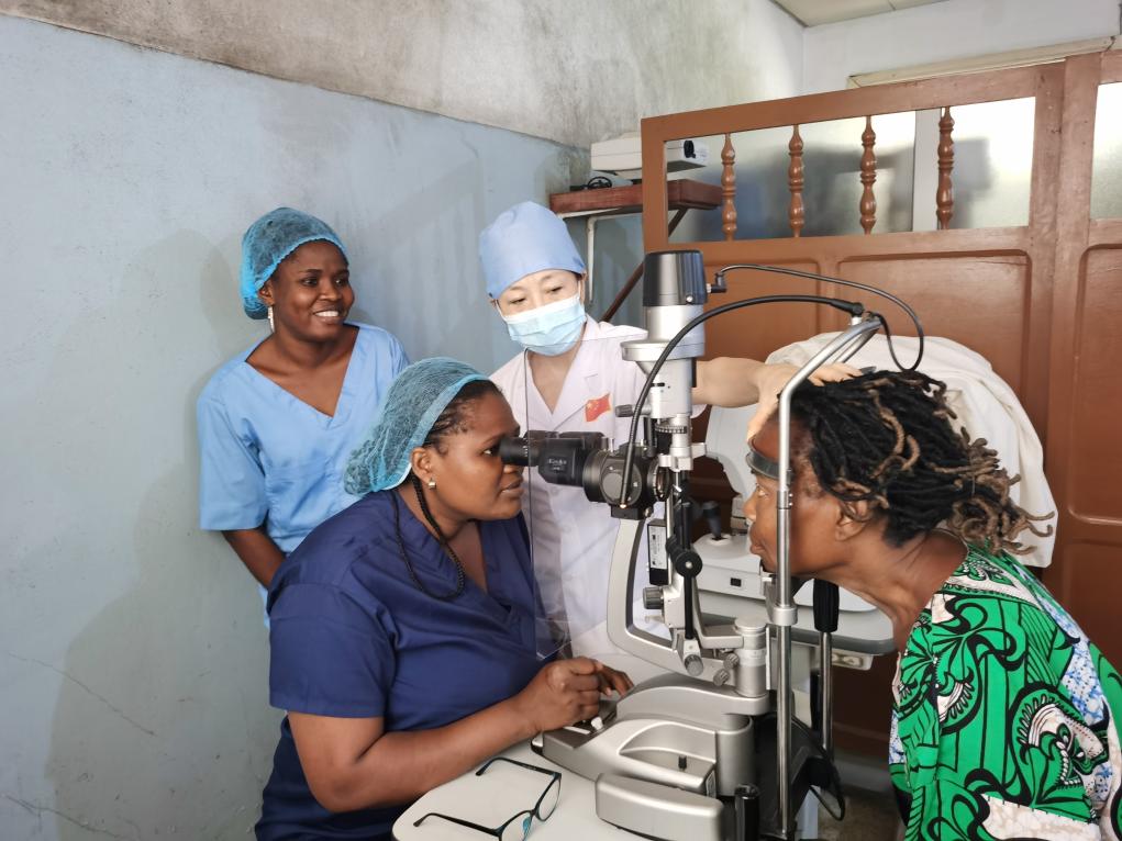 1月31日,在貝寧莫諾和庫福省中心醫(yī)院眼科診室,中國(guó)援貝寧醫(yī)療隊(duì)醫(yī)生正指導(dǎo)當(dāng)?shù)刈o(hù)士為患者做檢查。
