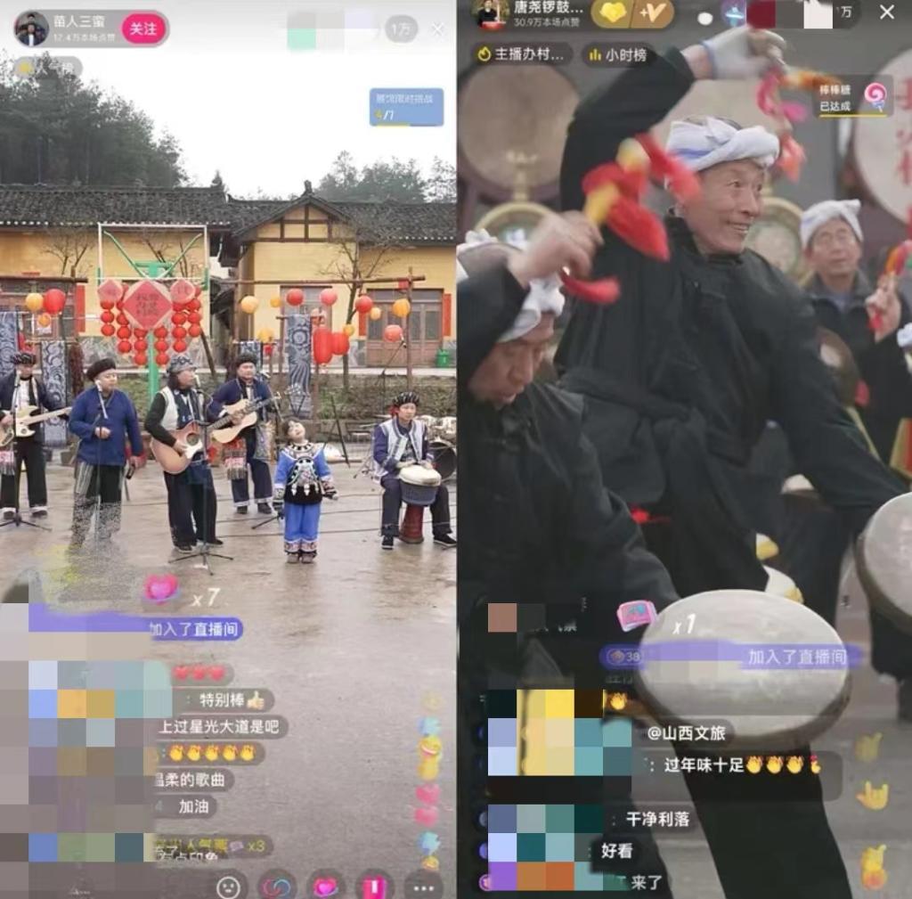 湖南省鳳凰縣臘爾山鎮(zhèn)苗寨中,4個“90后”苗族小伙組成樂隊自辦“村晚”,規(guī)模不大,唱火家鄉(xiāng);山西臨汾的村民們用簸箕、黃豆當(dāng)樂器,配合嗩吶和非遺晉南威風(fēng)鑼鼓,直播連線上千公里外的苗鄉(xiāng),南北大聯(lián)歡釋放獨特的精彩,吸引在線觀眾近800萬人……