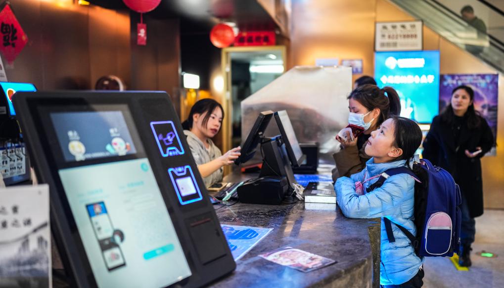 2月18日,小朋友在貴陽市云巖區(qū)益田國際影城選購電影票。新華社記者 陶亮 攝