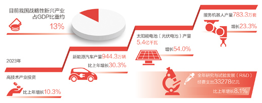 發(fā)展壯大戰(zhàn)略性新興產(chǎn)業(yè)。“戰(zhàn)略性新興產(chǎn)業(yè)具有創(chuàng)新活躍、技術(shù)密集等特點(diǎn),為新質(zhì)生產(chǎn)力發(fā)展壯大提供了巨大空間?!备呶拇碚f(shuō),近年來(lái),我國(guó)戰(zhàn)略性新興產(chǎn)業(yè)蓬勃發(fā)展,目前戰(zhàn)略性新興產(chǎn)業(yè)占GDP比重約13%。