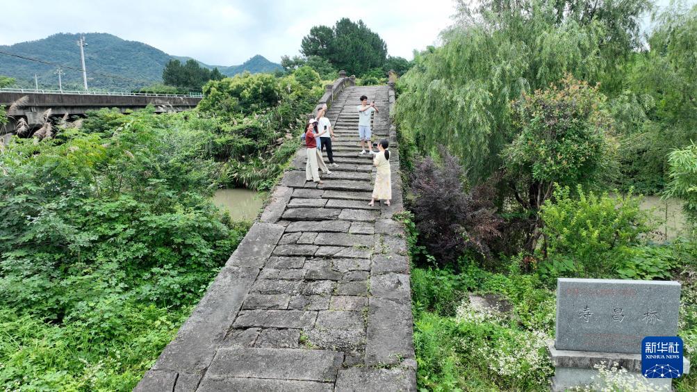6月26日,游客在德清縣下渚湖街道二都村壽昌橋拍照打卡(無(wú)人機(jī)照片)。(新華社發(fā) 謝尚國(guó) 攝)