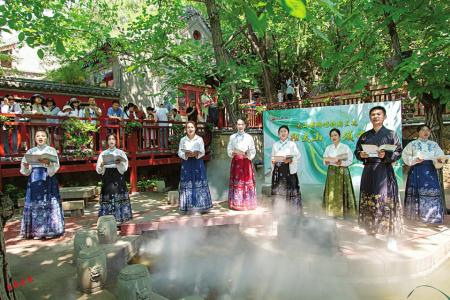 在太山景區(qū)售票廳里,背誦古詩(shī)詞免門(mén)票的活動(dòng)吸引了不少18周歲以下的學(xué)生參加,大家通過(guò)轉(zhuǎn)盤(pán)選定需要背誦的古詩(shī)詞,完成背誦即可獲得門(mén)票一張?!昂屯瑢W(xué)們正好一塊兒來(lái)了,通過(guò)參加這個(gè)活動(dòng),弘揚(yáng)我們的傳統(tǒng)文化,是非常有意義的。”今年暑期,太山景區(qū)面向廣大學(xué)生推出皮影戲、手工DIY印章、拓印等非遺體驗(yàn)活動(dòng)。同時(shí),景區(qū)還準(zhǔn)備了2000多套漢服,免費(fèi)為游客提供。