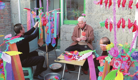 記者在現(xiàn)場看到,制作好的炮燈上有飄帶、繡球等裝飾,每盞炮燈不盡相同,畫有禾苗、動(dòng)物等不同圖案,寓意五谷豐登、六畜興旺,“孔雀展翅”“雄羊抵頭”“駿馬奔馳”等主題的炮燈活靈活現(xiàn)?!霸谖业挠洃浝?,我們村年年都有制作手工炮燈的傳統(tǒng),保存好的炮燈能用上兩年,燈架能代代相傳,我們有義務(wù)將這種技藝傳承發(fā)揚(yáng)下去……”67歲的村民翟慶如是村里制作炮燈的“行家”,他現(xiàn)場拿起一張彩紙給記者折起了炮燈上的裝飾。