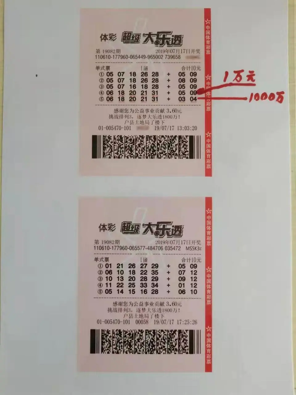 兩張彩票其中一張中獎,一組號碼中獎1萬元,另一組號碼中獎1000萬元
