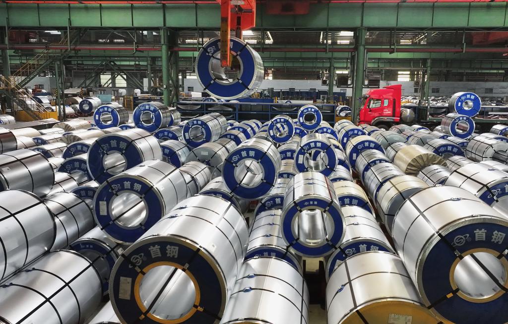 首鋼京唐公司成品車間的吊裝設備在吊運鋼板(無人機照片)。新華社記者 楊世堯 攝