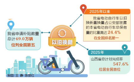 2025年以來,我省電動(dòng)自行車以舊換新置換量占公安部披露的本省電動(dòng)自行車總保有量的比重高達(dá)24.4%,在全國(guó)排名第一。以2025年全國(guó)建議工作量計(jì)算,山西省的總計(jì)劃完成率達(dá)到547.6%,位居全國(guó)首位。