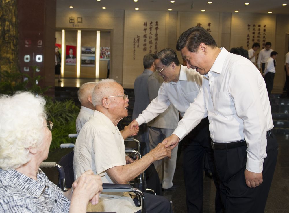 2014年7月7日,首都各界在中國人民抗日戰(zhàn)爭紀念館隆重集會,紀念全民族抗戰(zhàn)爆發(fā)77周年。習近平出席紀念儀式并發(fā)表重要講話。這是參觀結束后,習近平等親切看望參加儀式的抗戰(zhàn)老戰(zhàn)士和老同志代表。